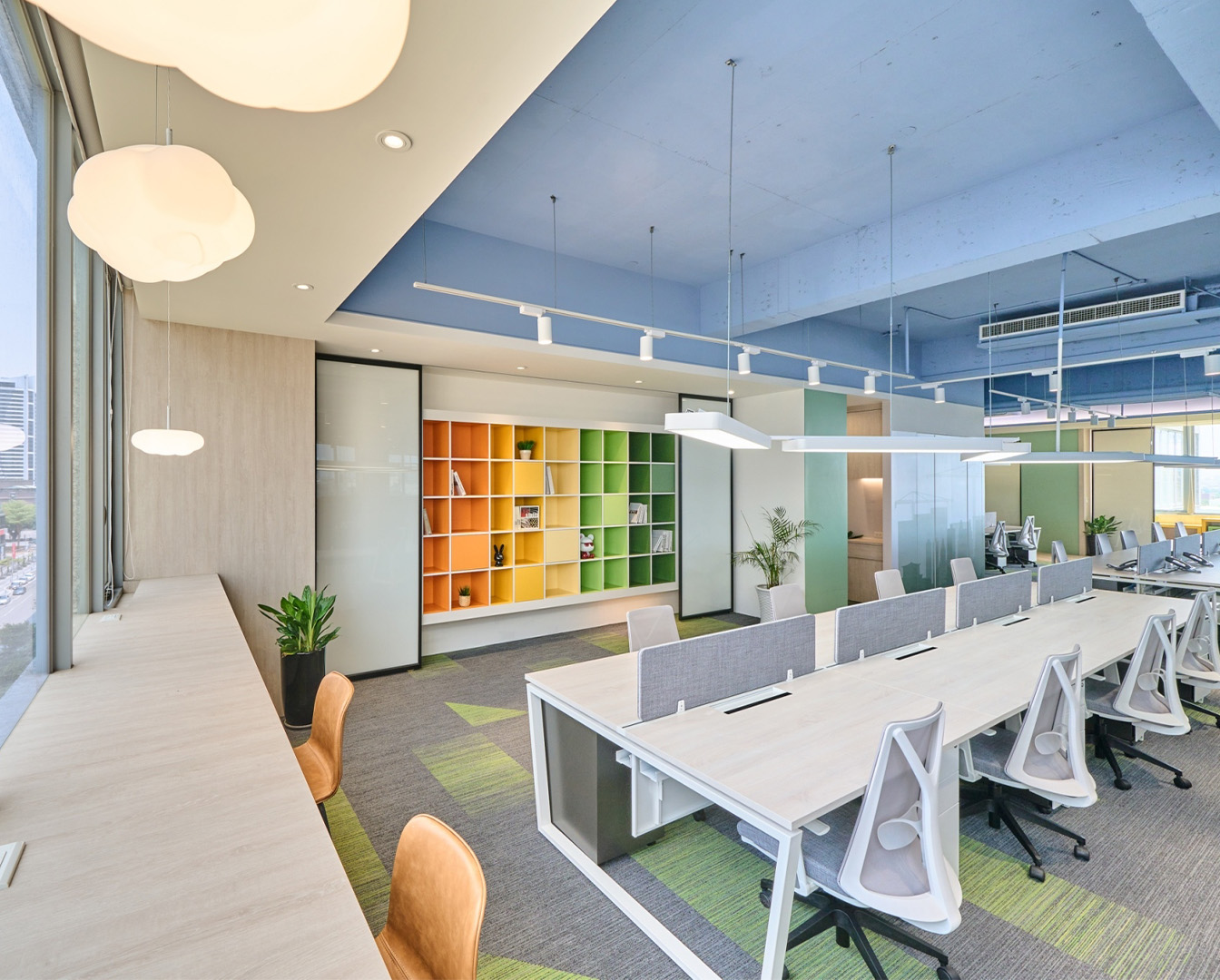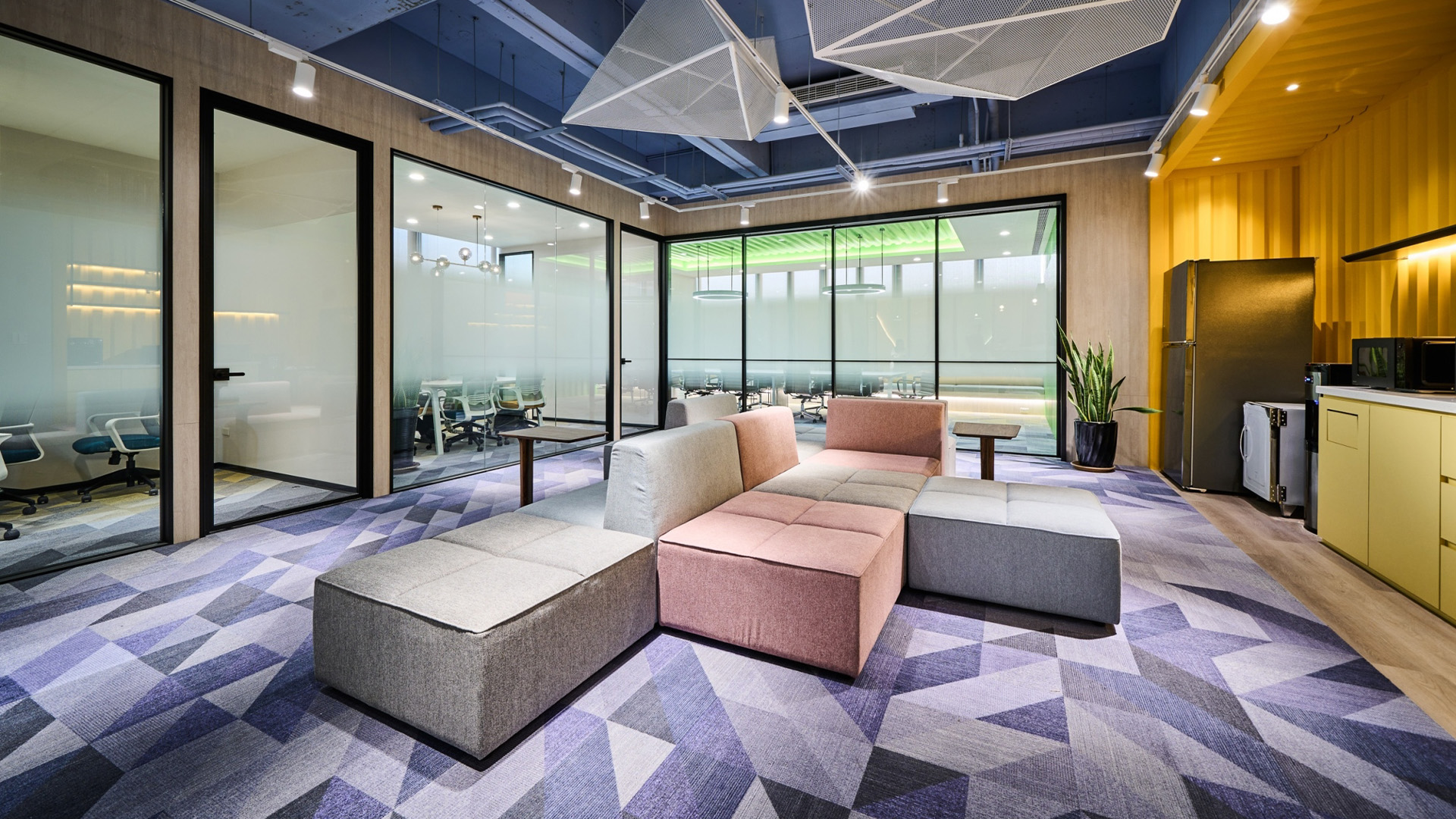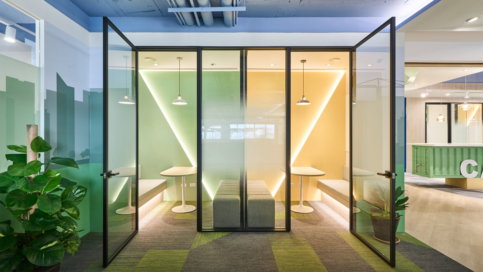 半客製「獨立會議包廂」延續高彩度設定,透過線性燈源與色溫配置,營造內外反差的空間感受,緩解傳統辦公空間的緊繃氛圍。
