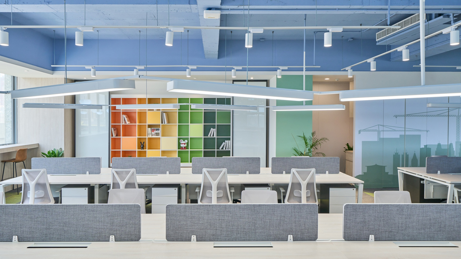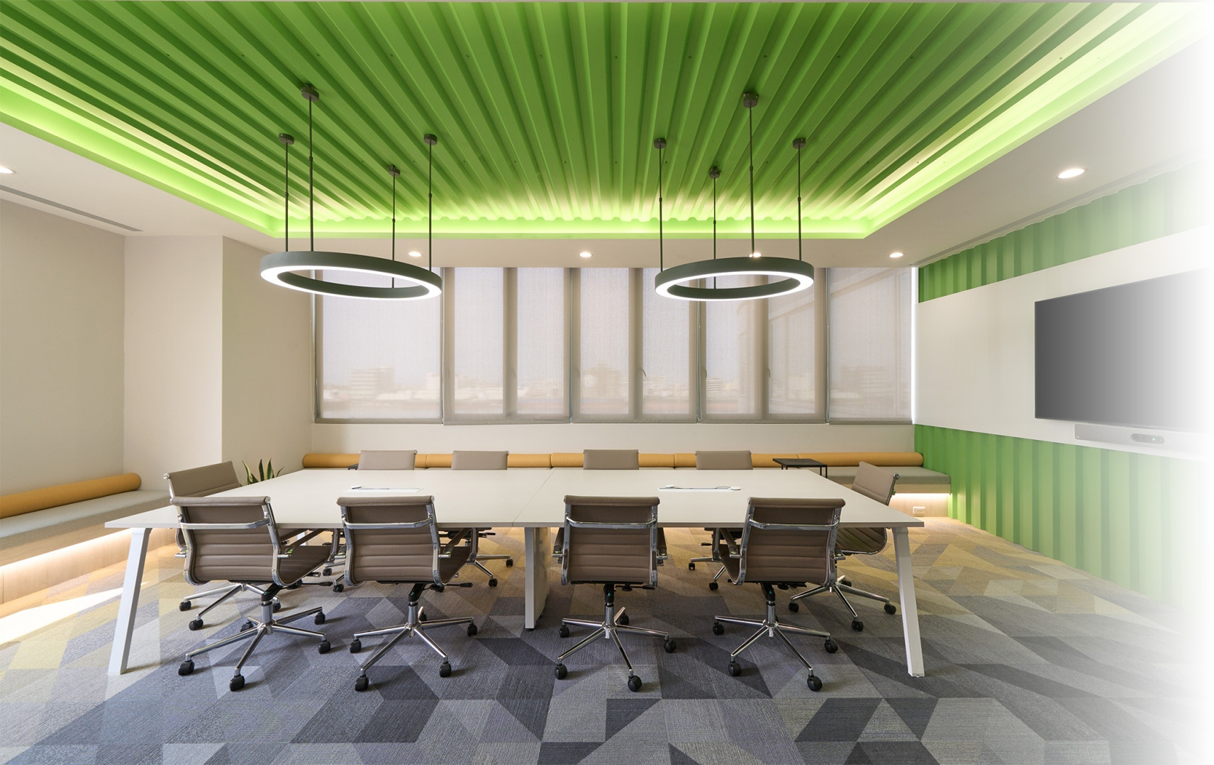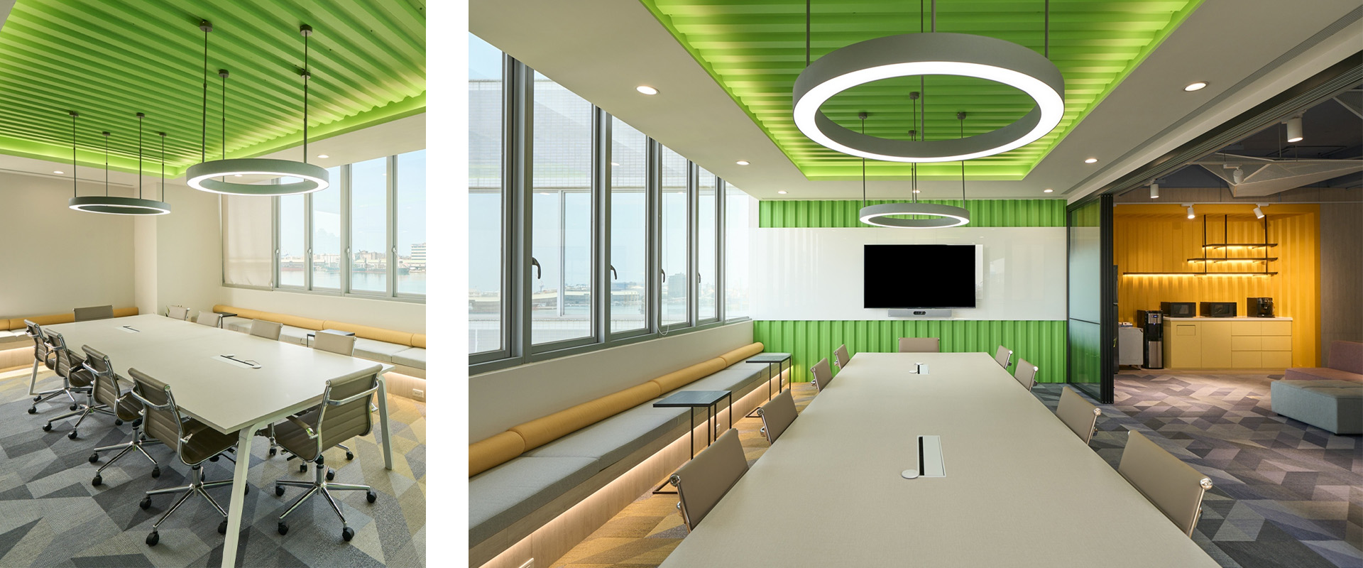 半客製「獨立會議包廂」延續高彩度設定,透過線性燈源與色溫配置,營造內外反差的空間感受,緩解傳統辦公空間的緊繃氛圍。