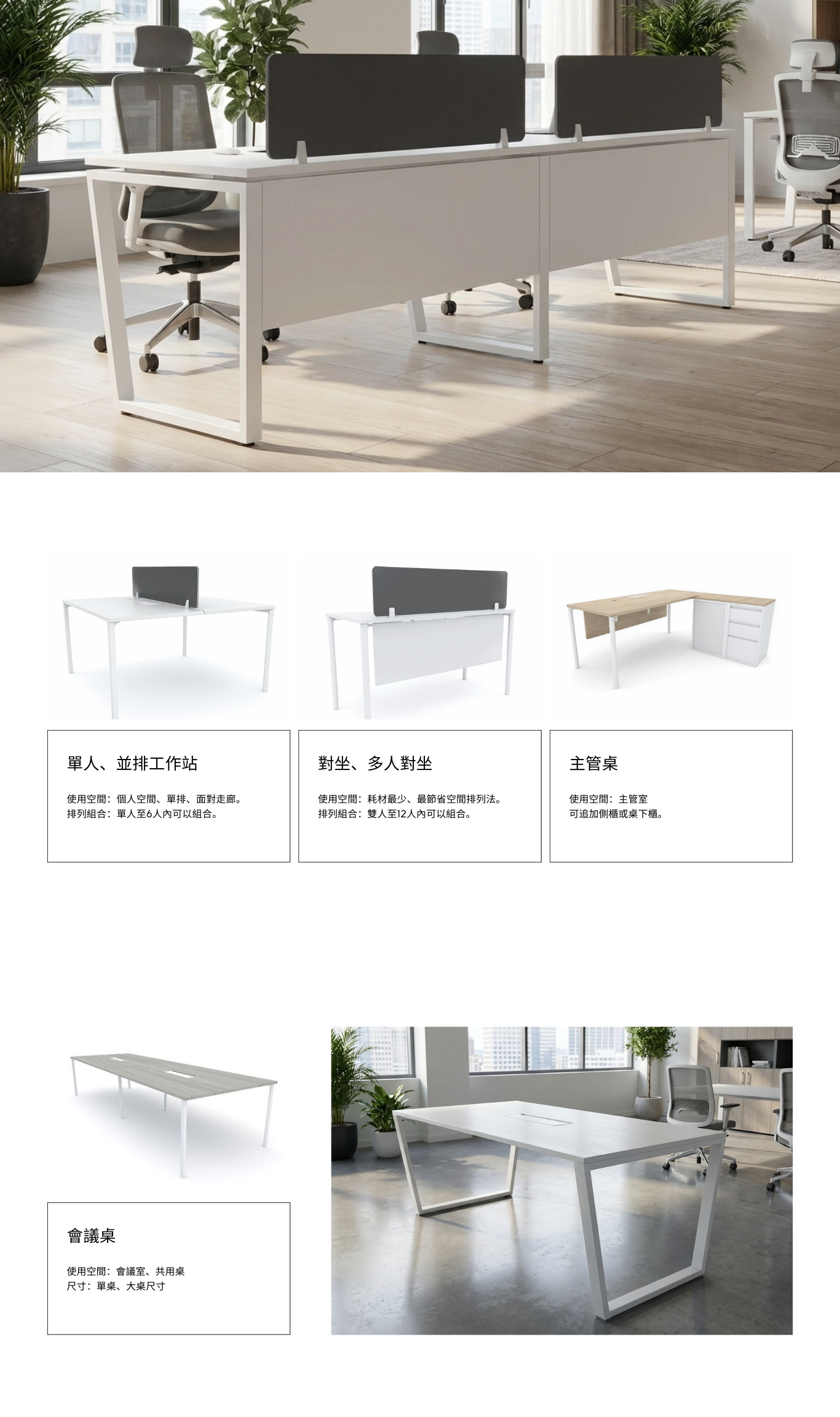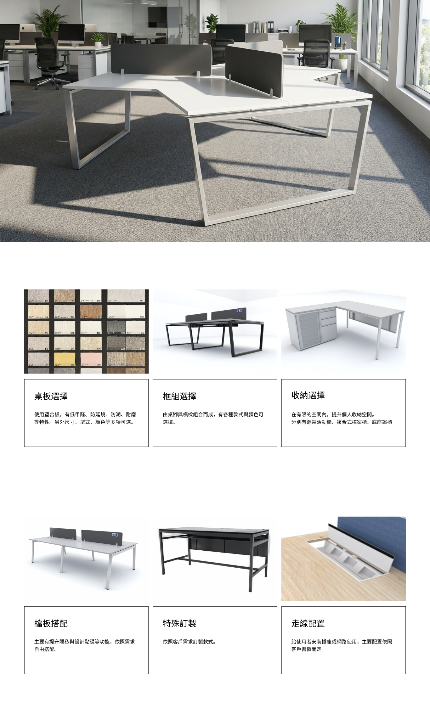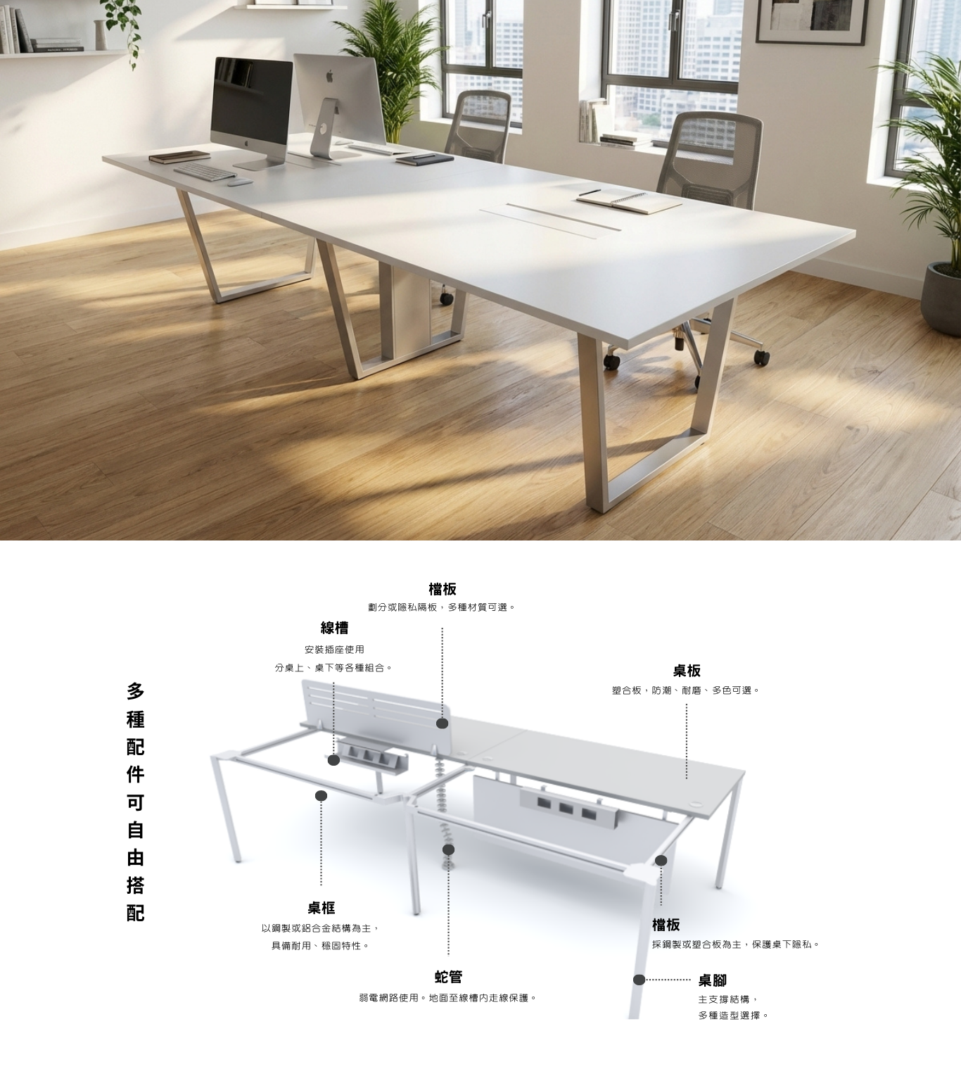 本款工作站採用經典、現代T梯形鋼架桌腳設計,是現代辦公家具中最可靠且普遍的結構之一。