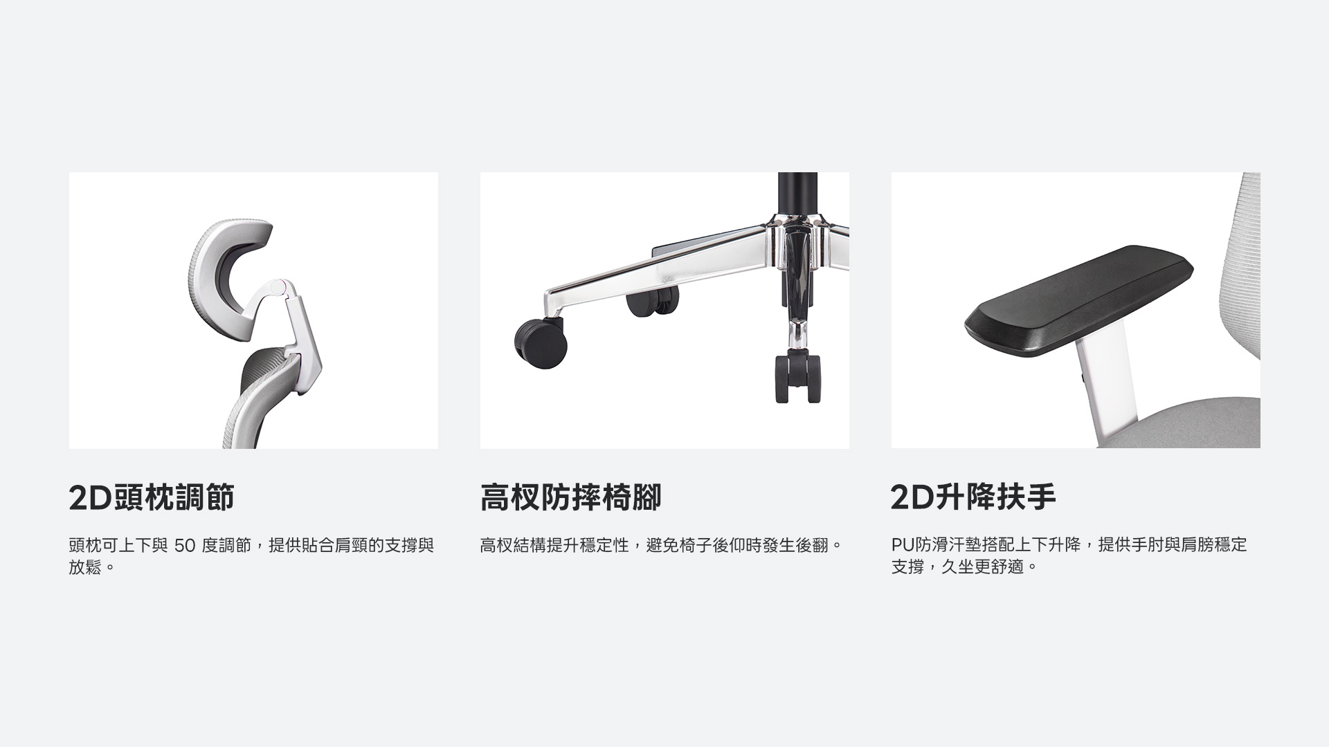 【 核心支撐 】具備可調頭枕與升降扶手,滿足基礎人體工學需求。